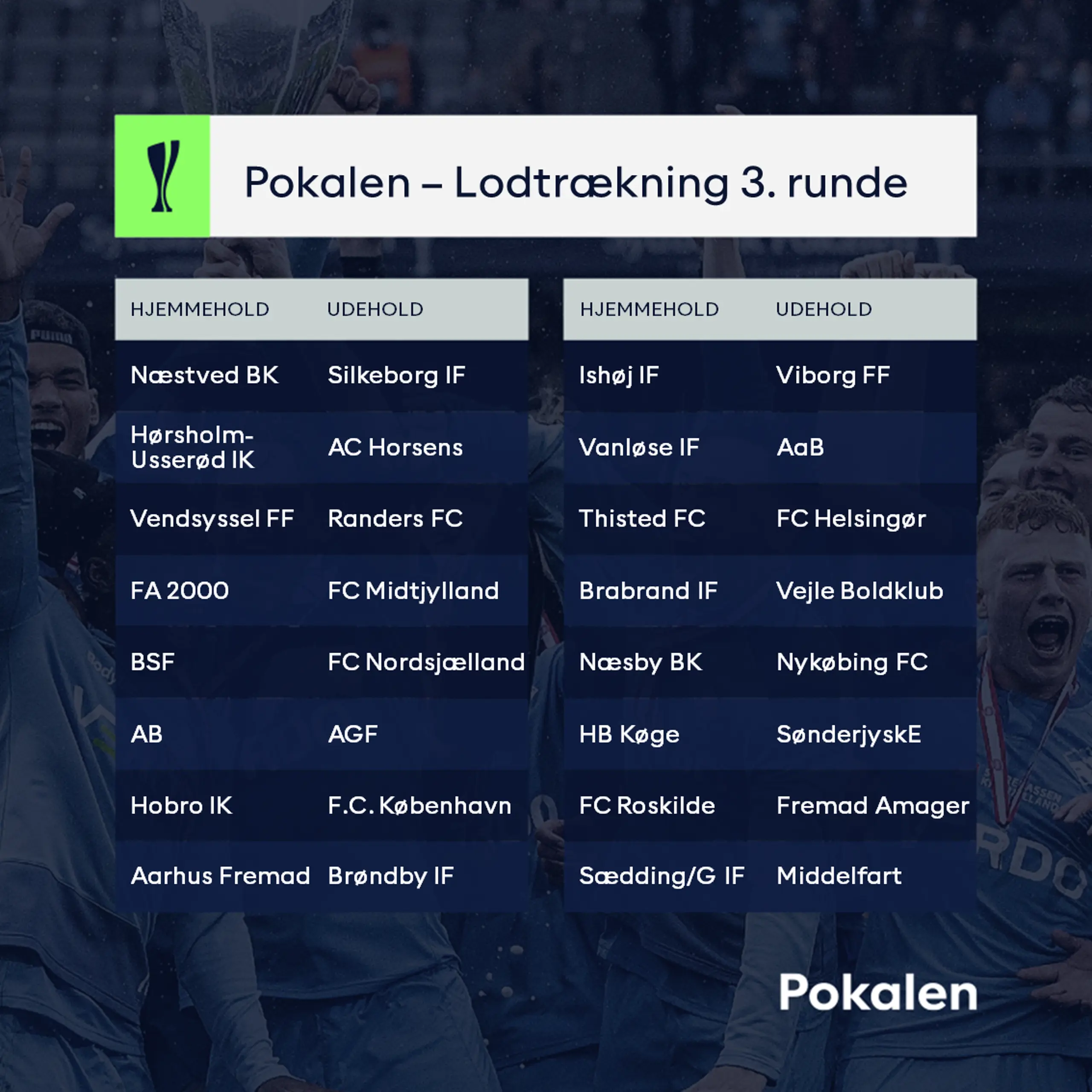 7. september 2022 Lodtrækning til 3. runde Der blev her til aften trukket lod til Pokalens 3. runde og det gav følgende kampe. 3. runde er programsat i dagene 18. til 20. oktober. 5. december 2025 De første tre kvartfinaler spillet 30. oktober 2025 Resultatet af lodtrækningen til kvartfinalerne i Oddset Pokalen 29. oktober 2025 Ottendedelsfinaler - 5 hold klar til kvartfinalerne 25. september 2025 FC Nordsjælland videre som sidste hold 24. september 2025 Resultatet af lodtrækningen til 4. runde i Oddset Pokalen