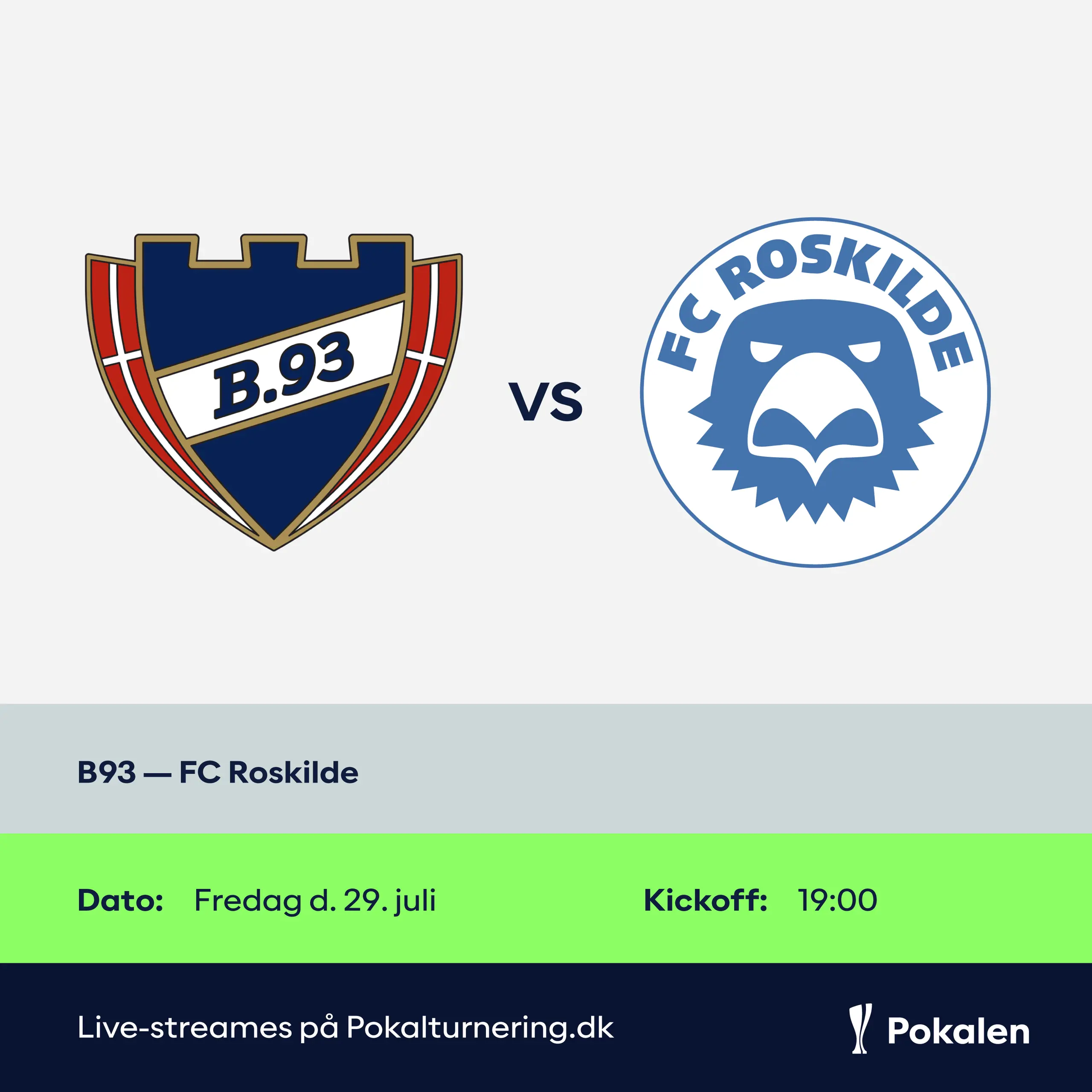 29. juli 2022 Pokalen sparkes i gang i aften når B93 får besøg af FC Roskilde Pokalen 2022 / 2023 sparkes i gang i aften når B93 får besøg af FC Roskilde. Kampen kan ses her på siden under fanen livestream fra kl. 19:00 - Drømmen Lever 5. december 2025 De første tre kvartfinaler spillet 30. oktober 2025 Resultatet af lodtrækningen til kvartfinalerne i Oddset Pokalen 29. oktober 2025 Ottendedelsfinaler - 5 hold klar til kvartfinalerne 25. september 2025 FC Nordsjælland videre som sidste hold 24. september 2025 Resultatet af lodtrækningen til 4. runde i Oddset Pokalen