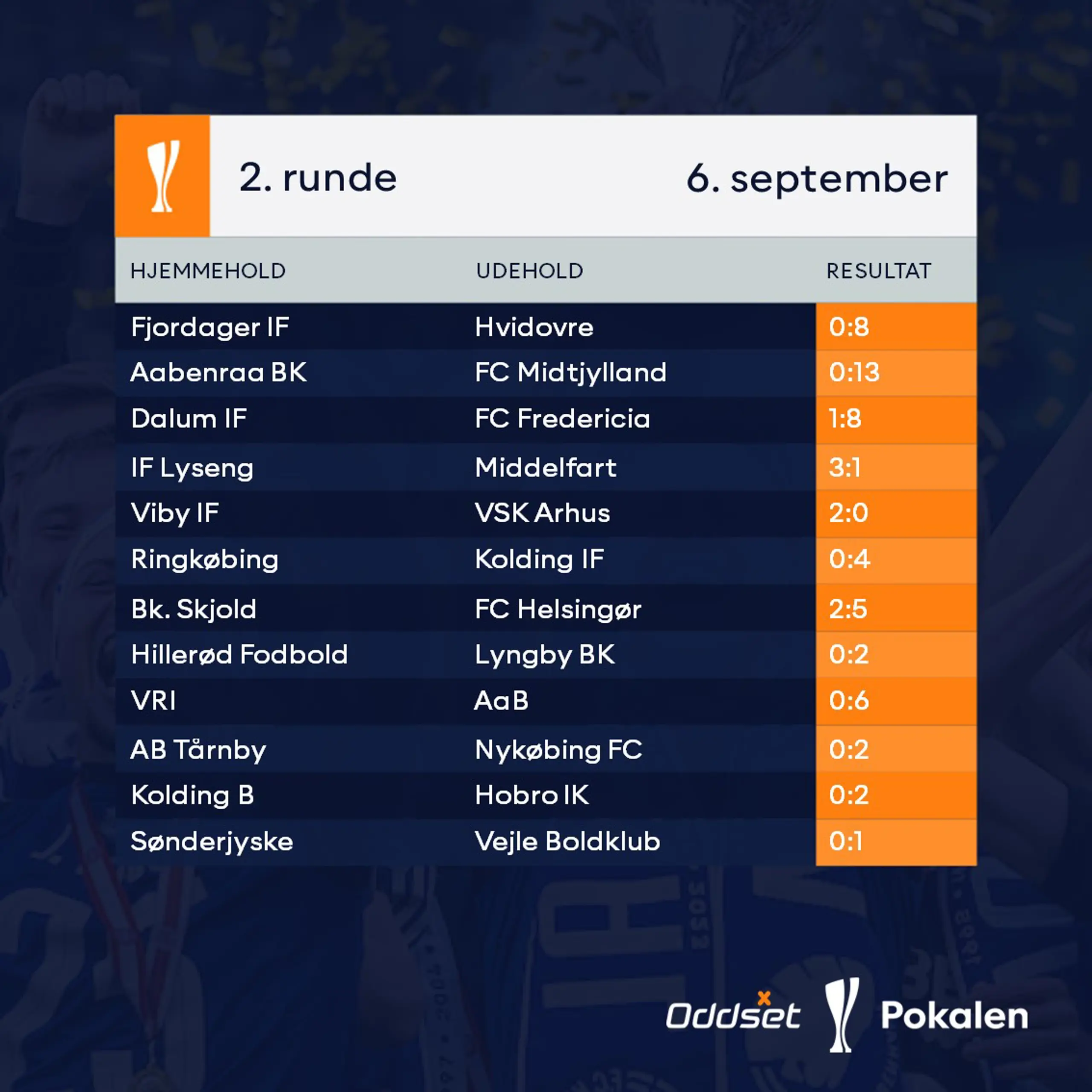 6. september 2023 En stor pokalaften er slut En stor pokalaften er slut! Det blev med masser af mål, mange favoritsejre og to små overraskelser. Vi glæder os til i morgen hvor der er yderligere 4 kampe på programmet – Drømmen Lever 5. december 2025 De første tre kvartfinaler spillet 30. oktober 2025 Resultatet af lodtrækningen til kvartfinalerne i Oddset Pokalen 29. oktober 2025 Ottendedelsfinaler - 5 hold klar til kvartfinalerne 25. september 2025 FC Nordsjælland videre som sidste hold 24. september 2025 Resultatet af lodtrækningen til 4. runde i Oddset Pokalen