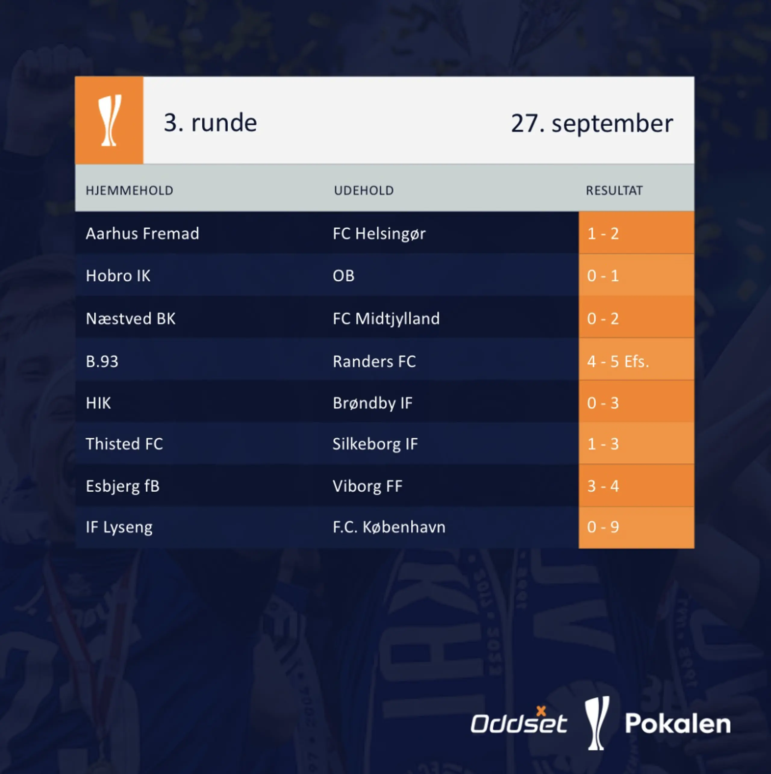 En stor pokalaften er slut, og yderligere 8 hold er klar til 4. runde. Det var lige ved og næsten i aften at de små kunne drille de store. Randers FC måtte helt ud i straffesparkskonkurrence før B93 var slået og Viborg scorede i sidste minut i 4-3 sejren over Esbjerg. De forsvarende pokalmestre fra F.C. København vandt klubbens største sejr nogensinde og er dermed sikkert videre.