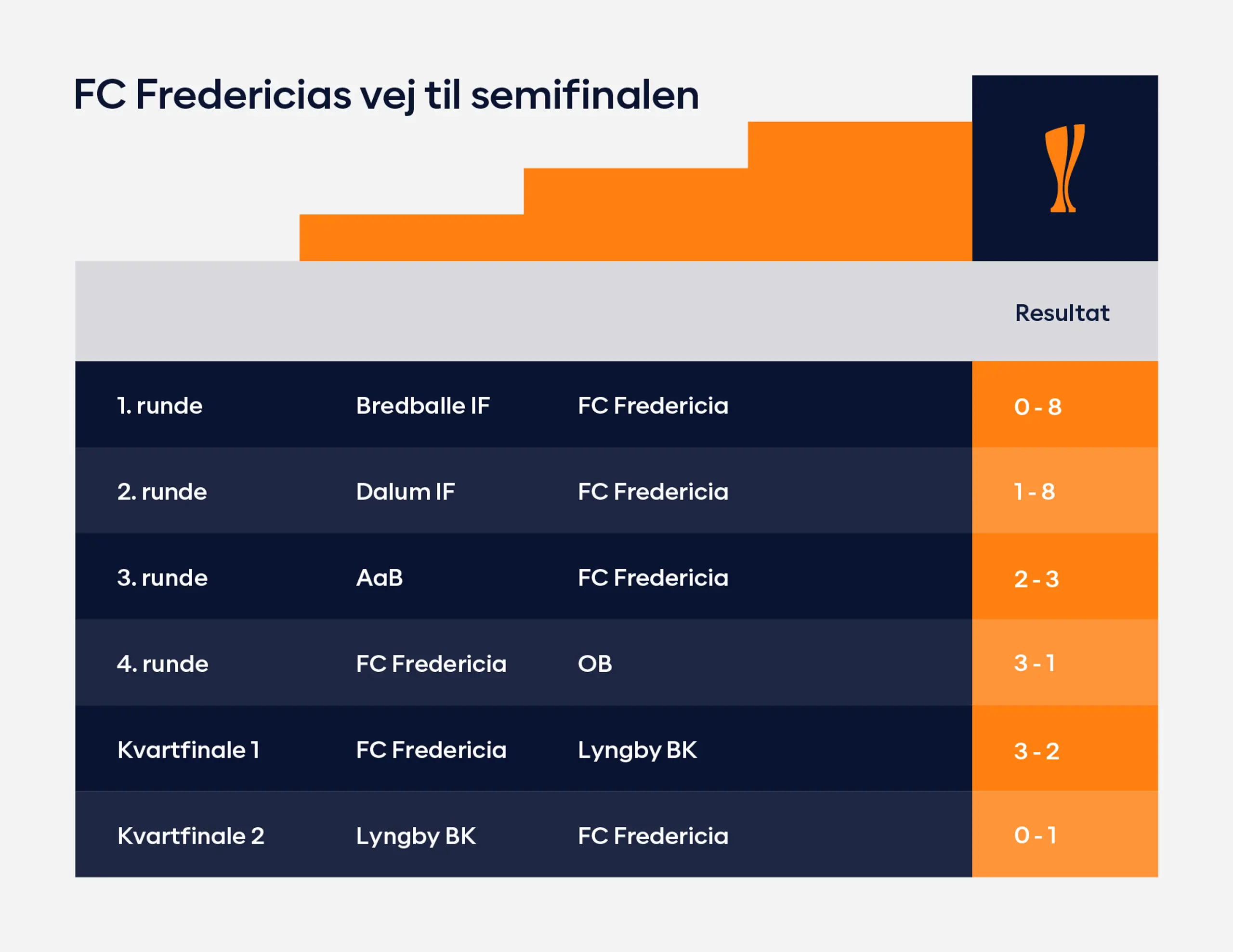 FC Fredericia har haft den længste vej til semifinalerne i Oddset Pokalen. Klubben trådte ind allerede i turneringens første runde, men de første par opgør viste sig ikke at være den store opgave for klubben fra NordicBet Liga.