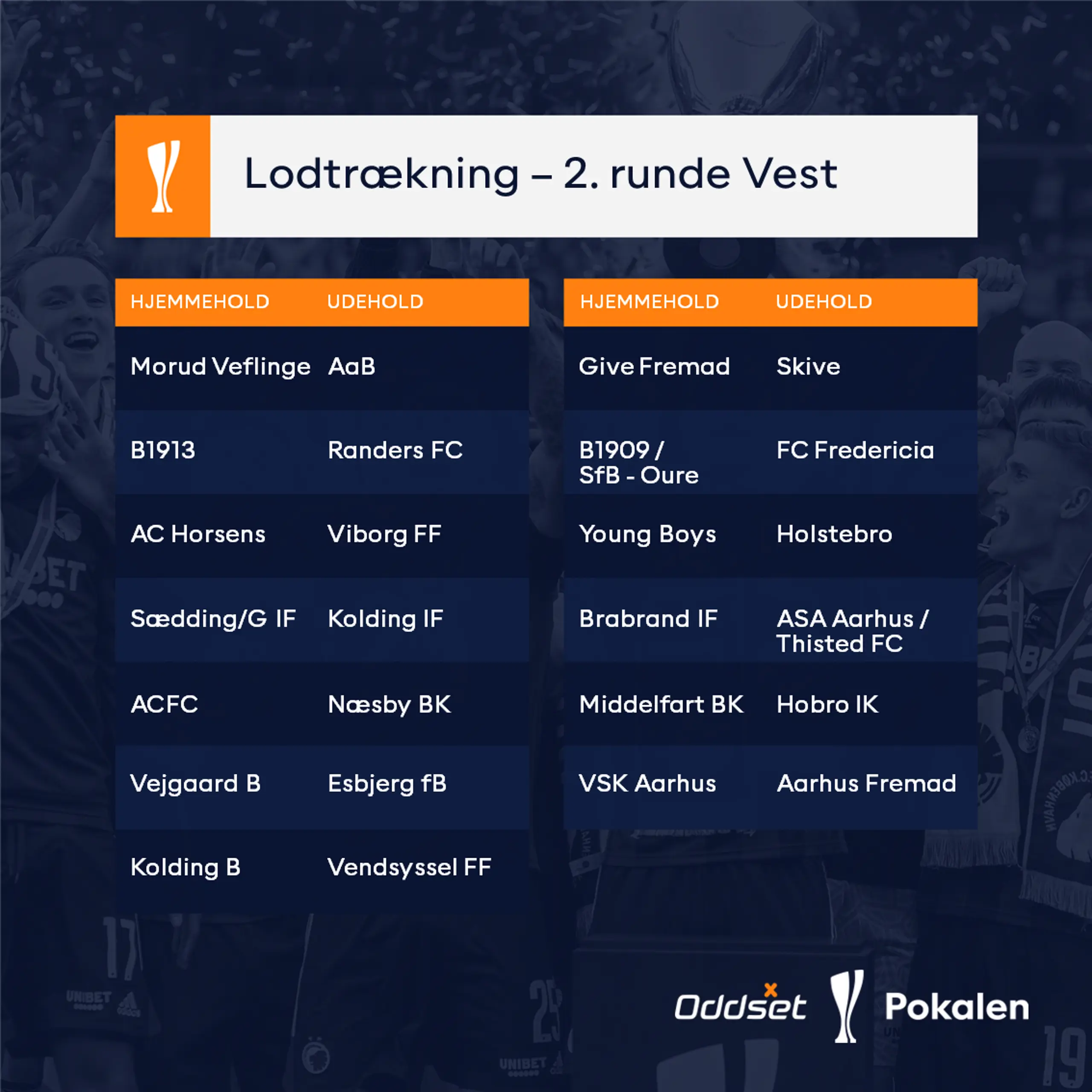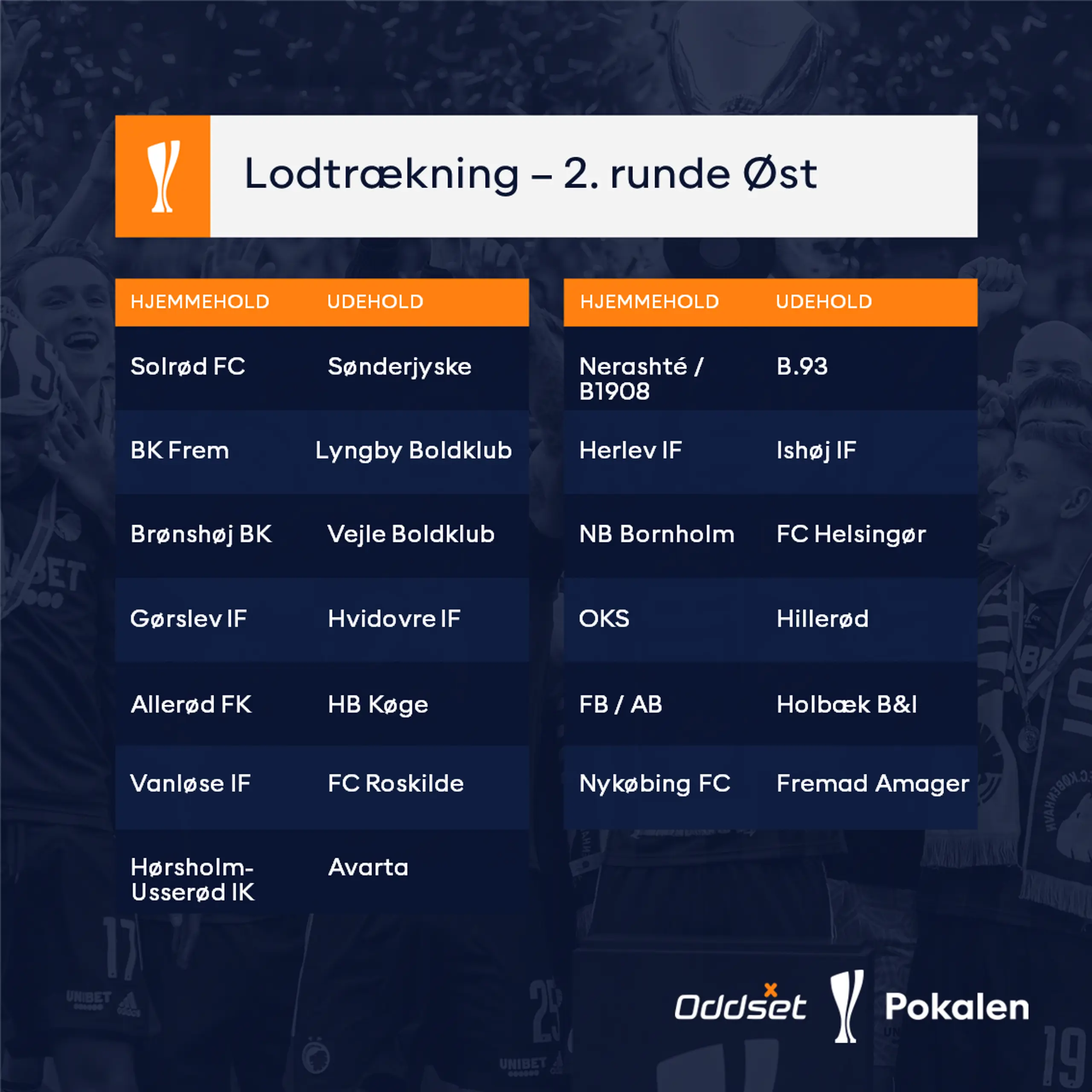9. august 2024 Lodtrækning til 2. runde Der blev her til aften trukket lod til Oddset Pokalens 2. runde og det gav følgende kampe, der er programsat i dagene 3. til 5. september 2024 - Drømmen Lever!