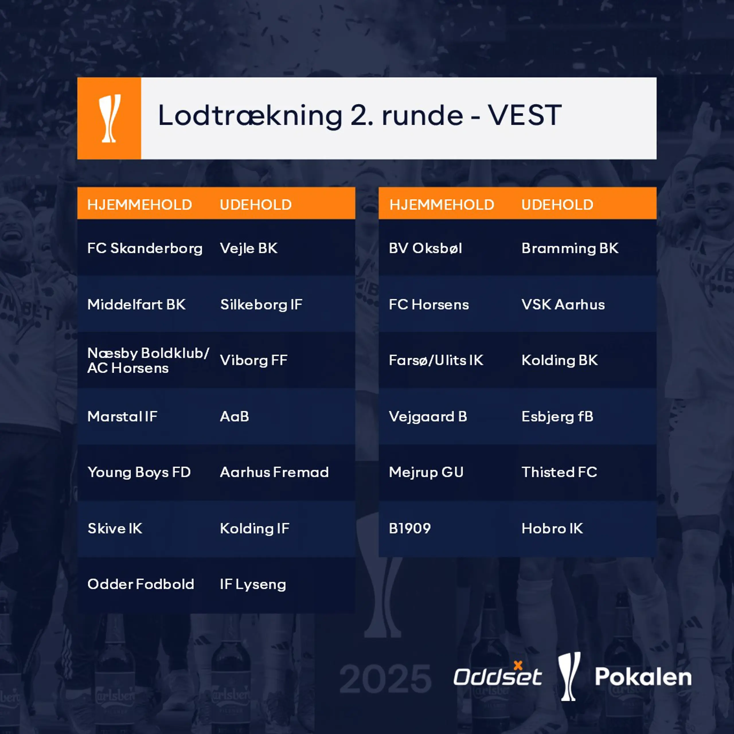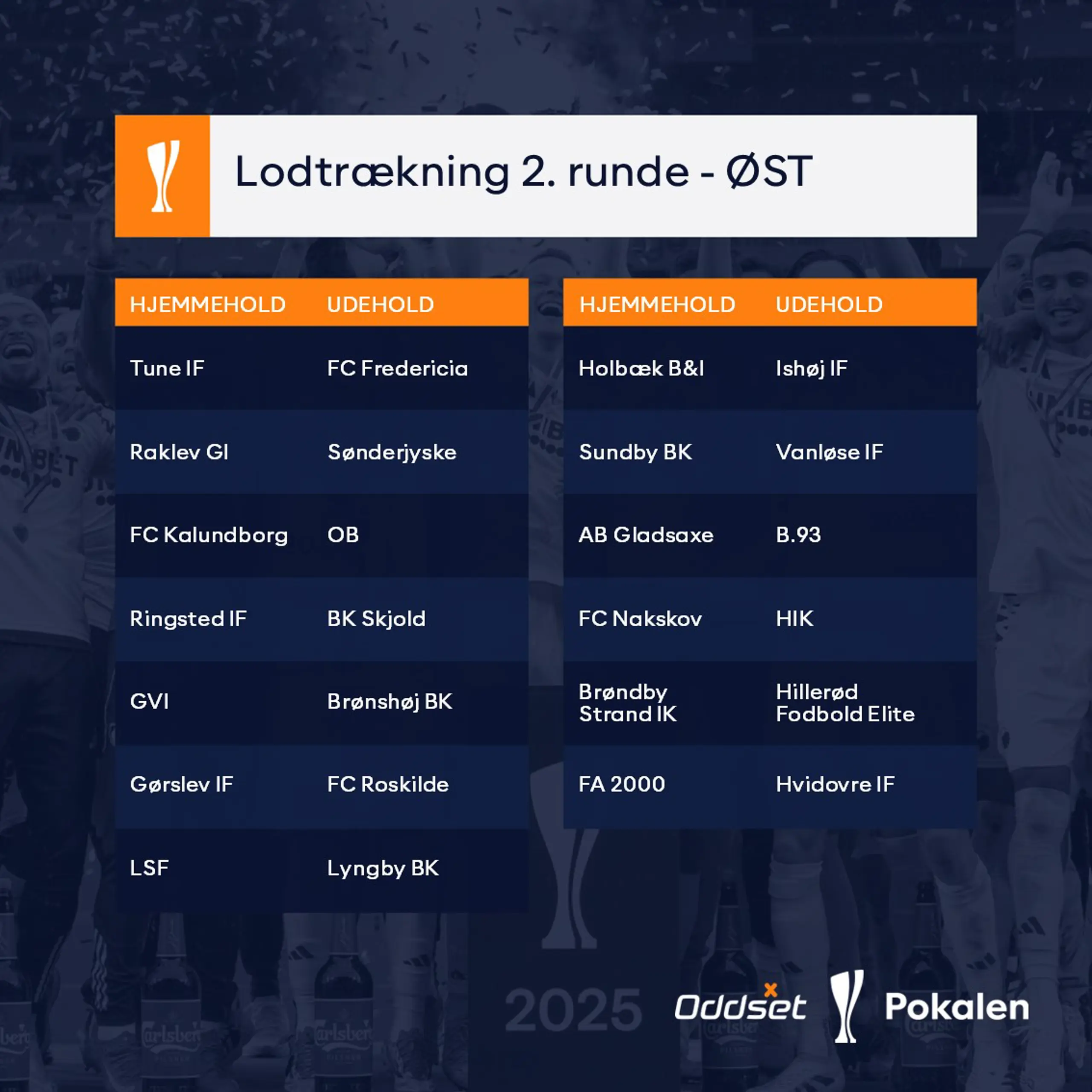 8. juli 2025 Resultatet af lodtrækningen til 2. runde i Oddset Pokalen Der er i dag trukket lod til 2. runde i Oddset Pokalen. Her er fordelingen af kampene i 2. runde, som spilles i dagene 2.-4. september 2025 - Drømmen Lever!